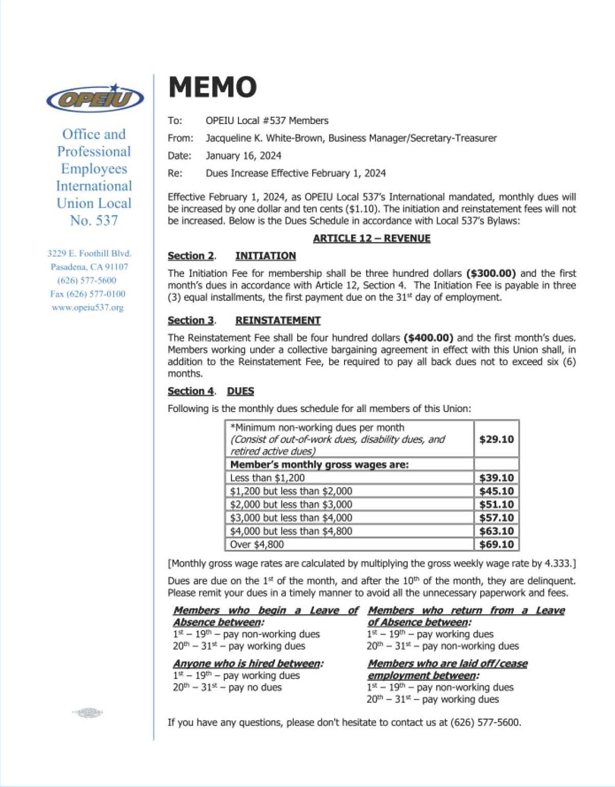 Each year, the OPEIU International Union imposes Per Capita increases on each Local, and in turn, each Local is expected to pass along the increase to its members. With this in mind, please take a moment to remember this important message: the last time Local 537 increased dues on its members was February 1, 2019. For the past four years, the per capita increase has yet to be passed on to our members, as mandated by our International Union. This increase in the International Per Capita has been absorbed from our budget. We have experienced enormous legal fees due to our continuous fight with some of our employers. While Local 537 tries to minimize the costs to our members, we can no longer absorb the increase.